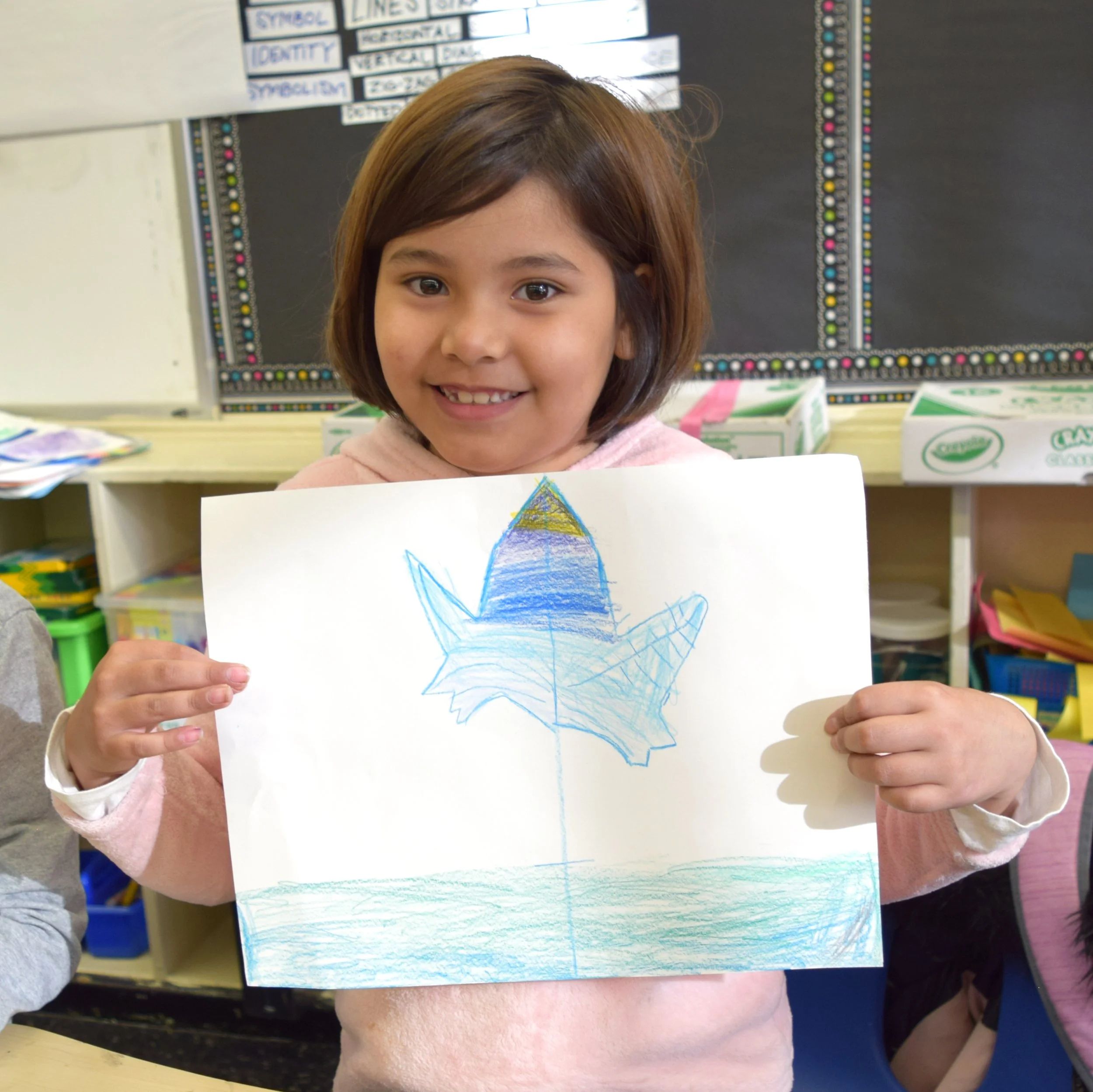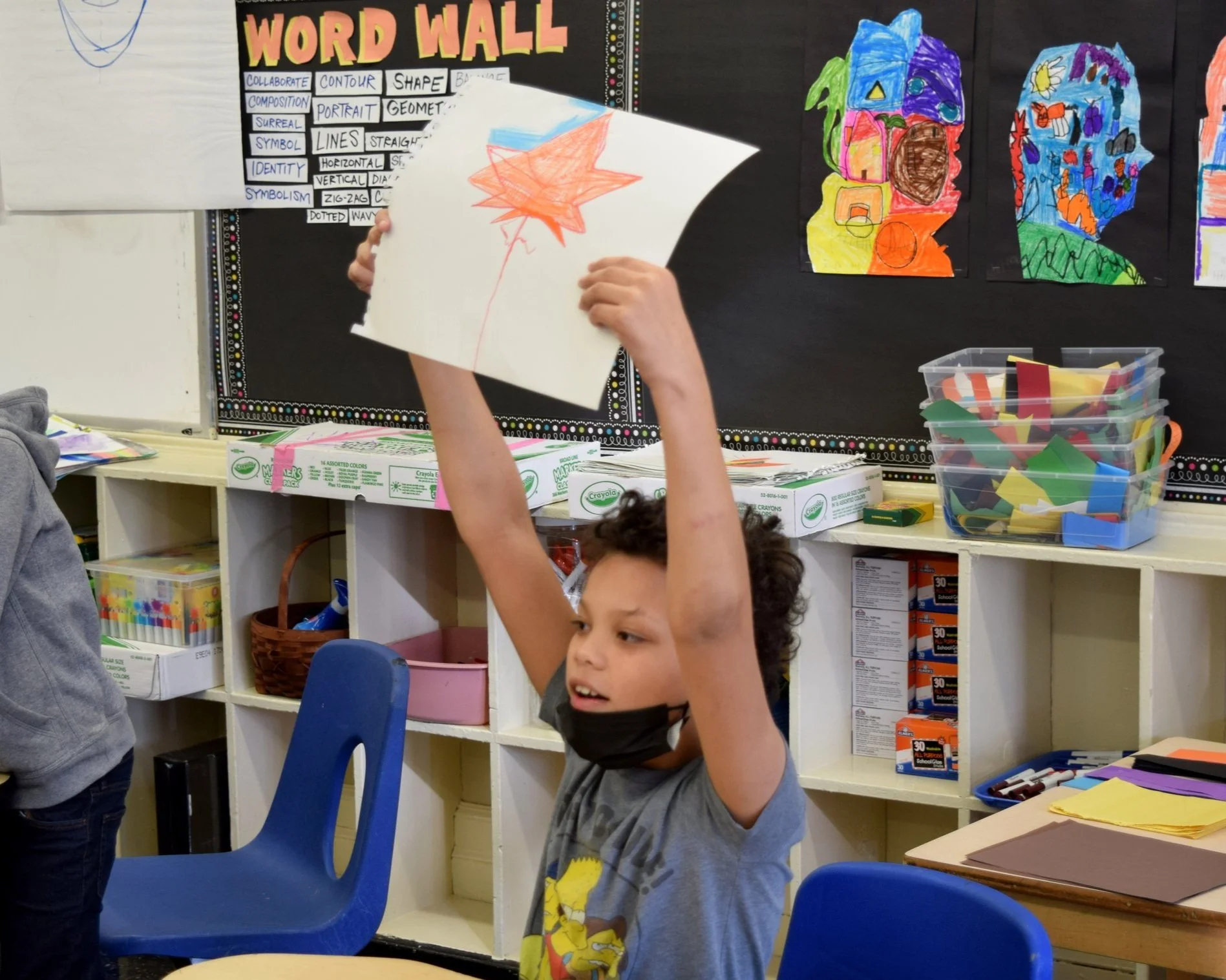 On a brisk fall morning at PS/MS 4 in Crotona Park West, Creative Art Works Teaching Artist Liv Mourao is teaching third-grade students how to draw a maple leaf. The step-by-step approach is meant to demonstrate that anything that you might want to draw can be broken down into basic shapes. (A maple leaf is essentially a collection of triangles.) Along the way, students pick up some new vocabulary, or reinforce recently acquired words, such as: symmetry, asymmetry, balance, and angles. They also improve fine motor skills, practice active listening, and find the confidence to try out new things within the structure of the lesson.