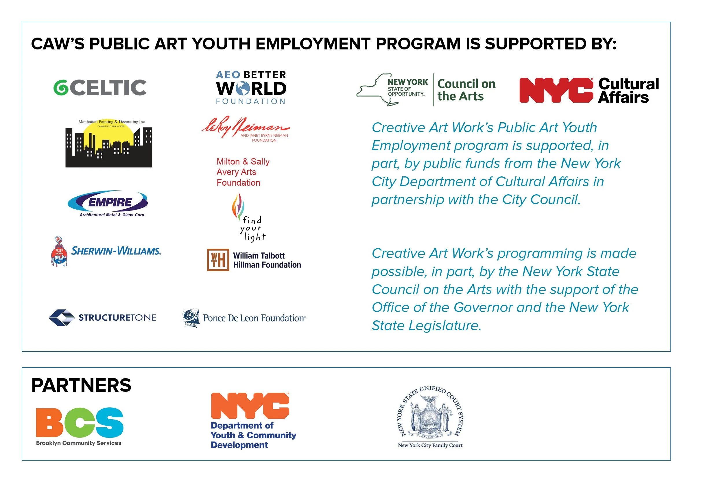 On the upper floors of Kings County Family Court, 29 Creative Art Works Youth Apprentices (YAs) are putting the finishing touches on a remarkable series of paintings which will soon enliven a public waiting area. Since 2011, CAW has offered dozens of employment projects in partnership with NYC Family Court, yielding over 30 individual works of art, but this is the first one in Brooklyn.