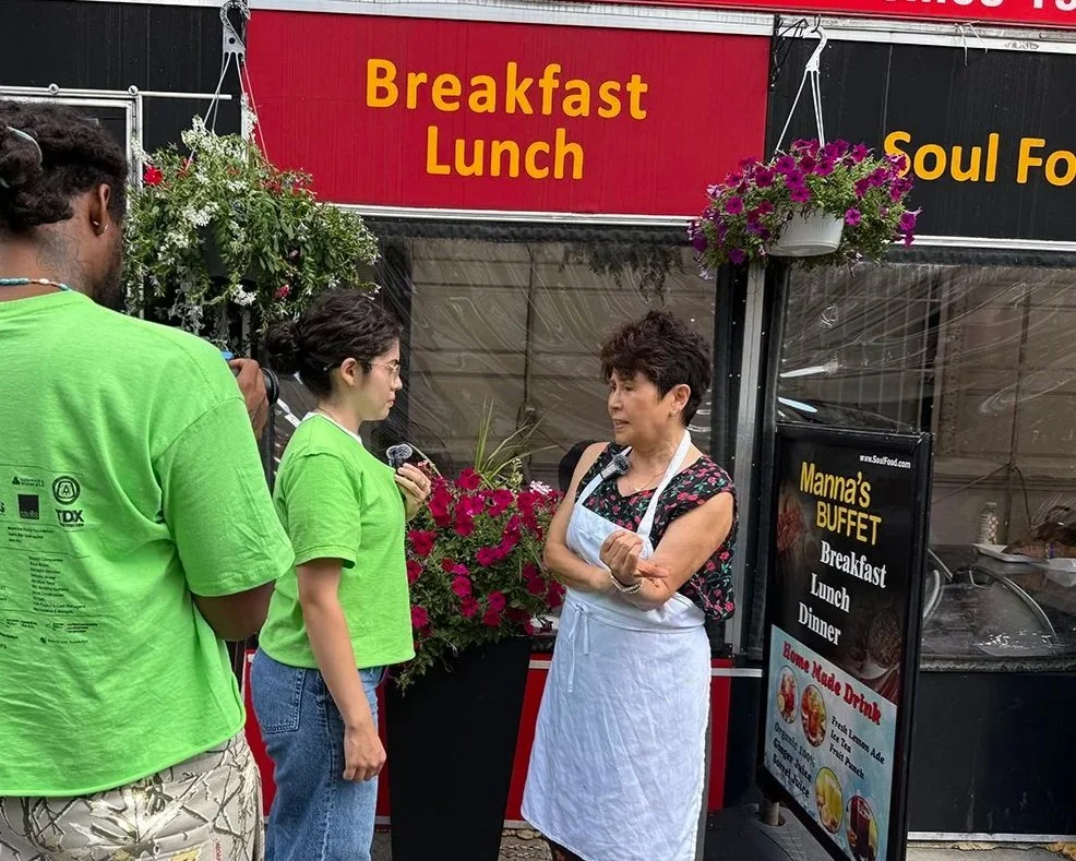 Teaching Artist Assistant-in-Training Alison Martinez (center) interviews the owner of Manna’s Soul Food