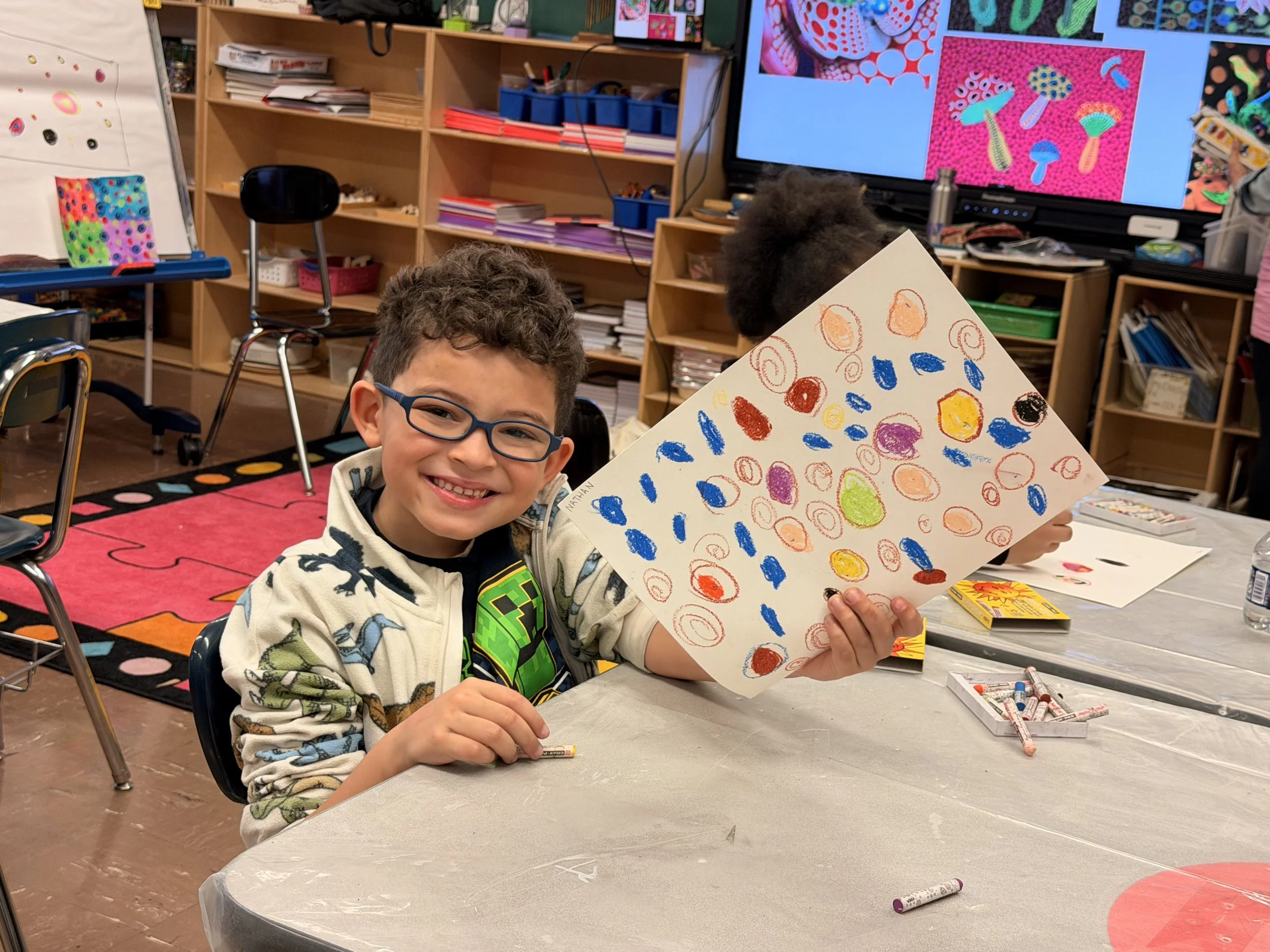 In reading “Yayoi Kusama Covered Everything in Dots and Wasn’t Sorry” by Fausto Gilberti, students at PS 155 learned how Kusama expressed feelings and ideas by transforming spaces and objects with repeating dots. They then used oil pastels and watercolors to design patterns with repeated shapes (dots, zigzags, spirals, fringe). These patterned pieces of paper will be cut and folded into whimsical flowers in a future class.