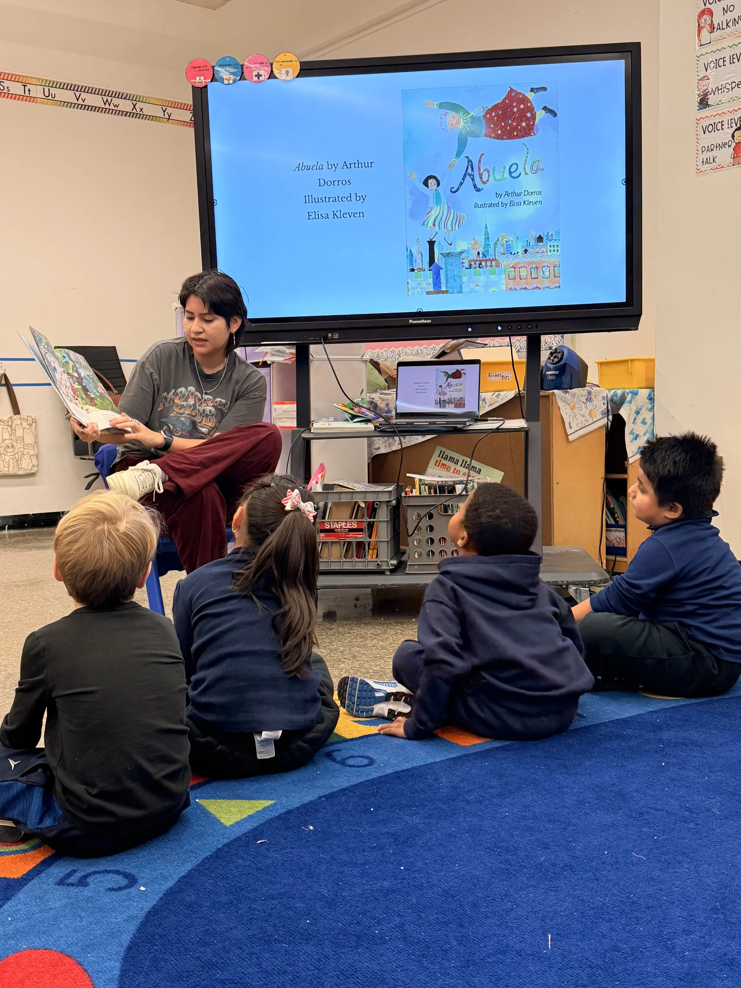 The “adventure” is as internal as much as it is creative. Students are invited to reflect on their daily experiences, senses, and inner worlds—often without realizing they are engaging in “reflection” at all. For example, after a reading of the book “Abuela” by Arthur Dorros, students think about how sensory elements, such as smell, sight, and sound, are used to illustrate emotions, daily experiences, and identity.